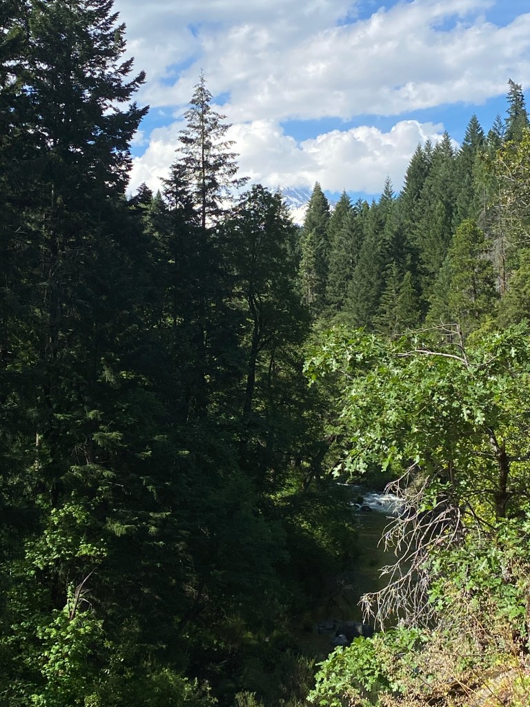 If you continue past the falls there is a bench which will allow you to admire the scene from afar. Continue down the trail that parallels Hatch Creek to a nice sized observation deck. From the deck you get a good view of Mount Shasta and the Sacramento river. She just peeked through the trees and below the clouds for me on this day.